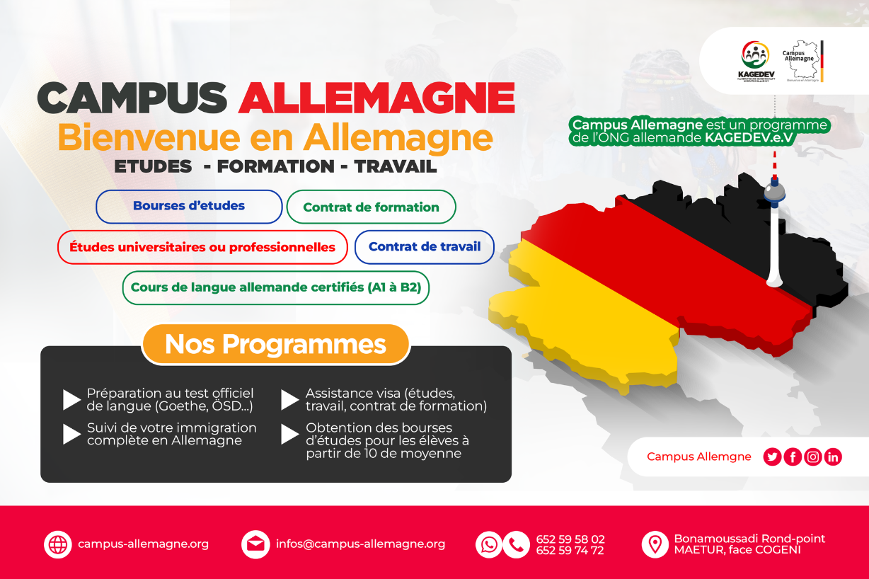 Campus Allemagne recrute 15 nouveaux candidats, âgés de 17 à 30 ans, résidant à Douala et possédant un baccalauréat (toute série confondue), motivés pour apprendre l’allemand jusqu’au niveau B2 dans son campus de Douala – Bonamoussadi. Ces candidats auront ensuite l’opportunité de partir en Allemagne pour suivre une formation professionnelle rémunérée dans l’une des 40 formations professionnelles disponibles en Allemagne.